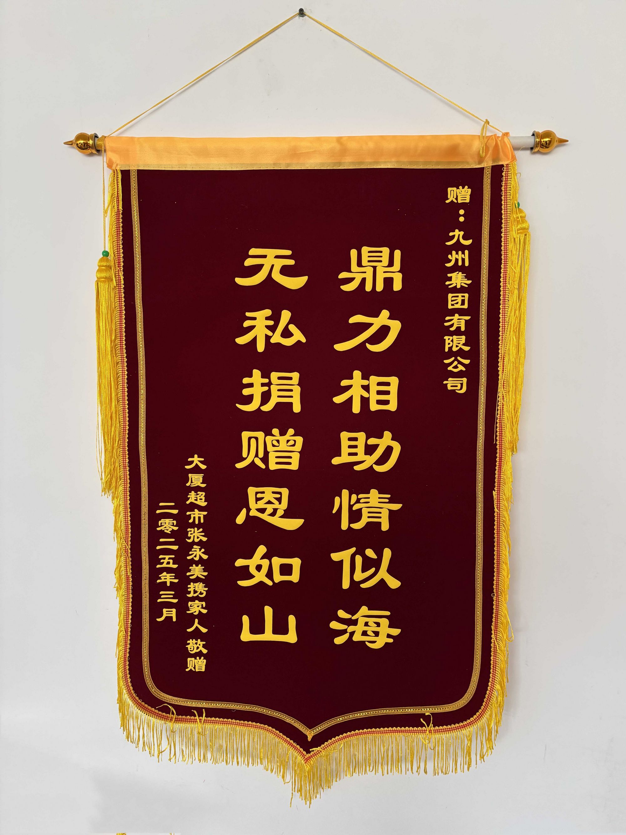 3月6日上午,一面寫有“鼎力相助情似海,無私捐贈(zèng)恩如山”的錦旗及一封感謝信送到了九州集團(tuán),為這個(gè)忙碌的工作日增添了一抹溫馨色彩。