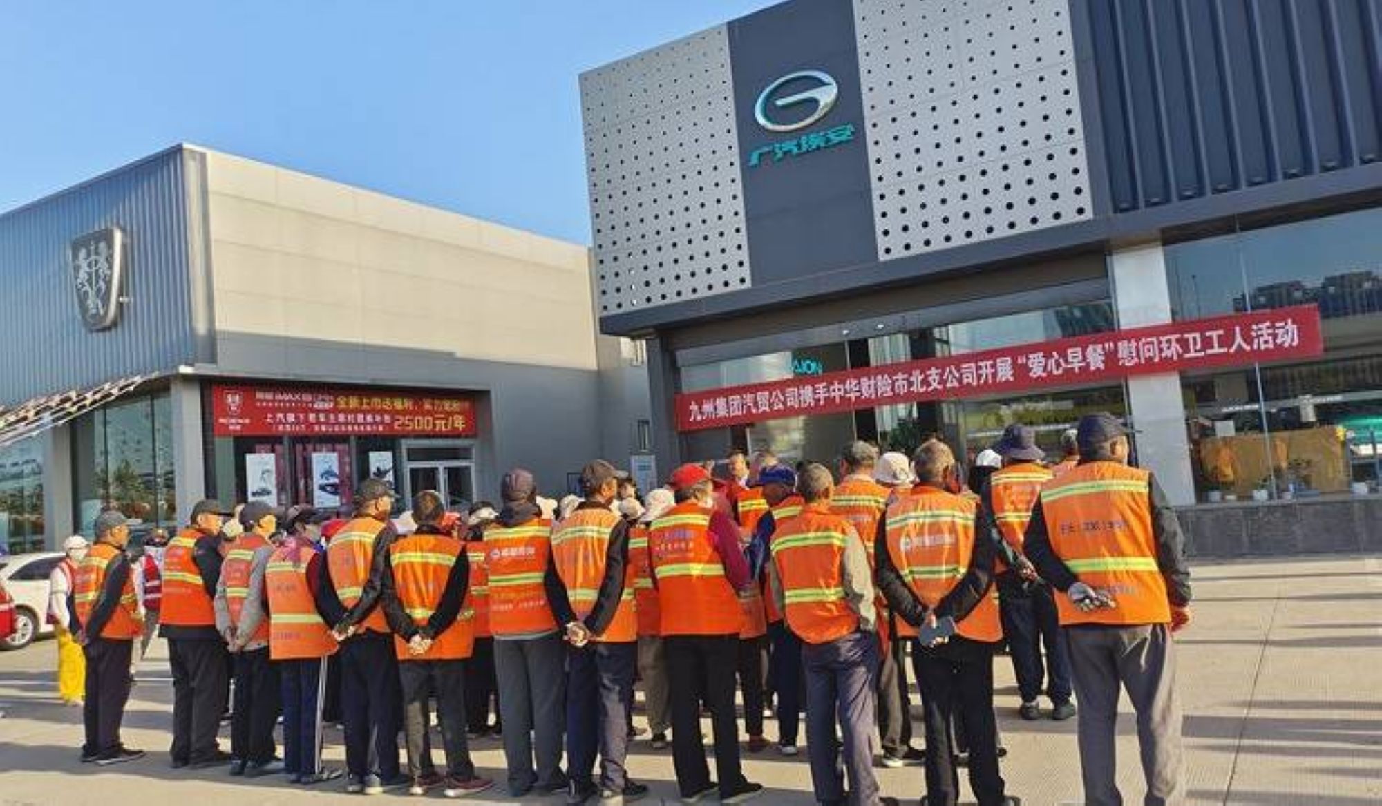 4月15日早上,九州汽貿(mào)攜手中華財險市北支公司在九州埃安4S店門前廣場開展了“愛心早餐”慰問環(huán)衛(wèi)工人活動,為“喚醒城市的美容師”送上了春日清晨的第一份溫暖。