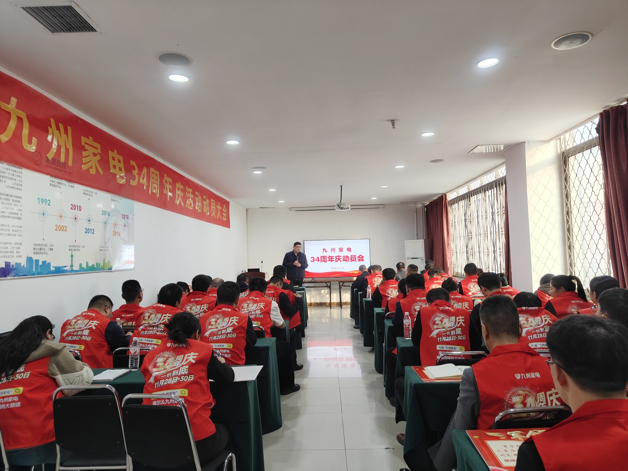 11月14日下午,九州家電34周年慶動(dòng)員會(huì)在解放路店二樓會(huì)議室召開。九州家電主管及以上管理人員共50余人參加了會(huì)議。